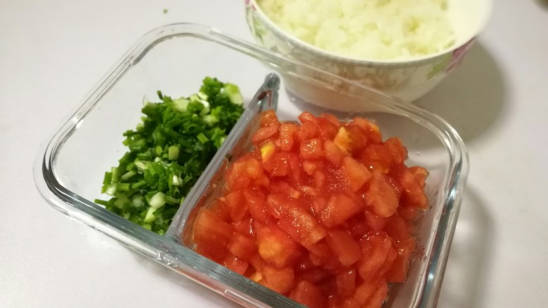 2. 西红柿去皮,切丁。葱切碎。待用。