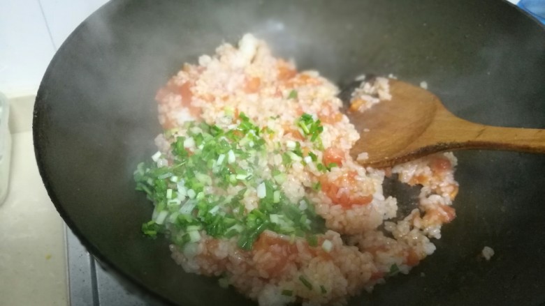 4. 翻炒至出汁,加入米饭,加2g盐左右。 (这个汁水都是西红柿的,不用另外加水。另外,盐也不需要太多,纯主食清淡为好,且西红柿本身有味道。)