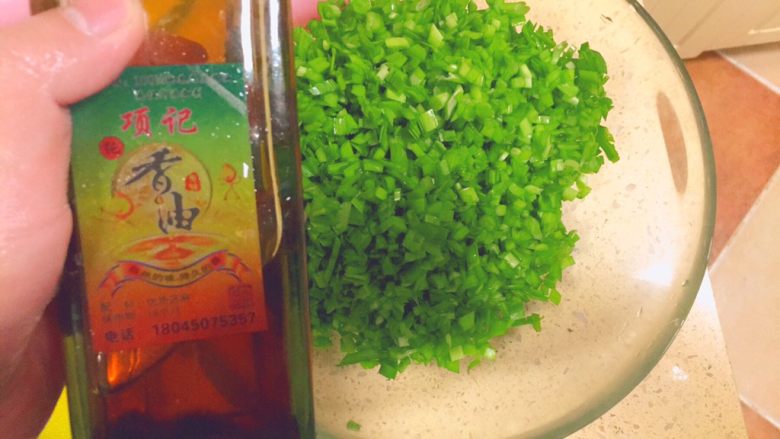 13. 然后。这时候鸡蛋应该冷却得不那么热了吧?我们开始拌馅。韭菜切碎丁。然后加20毫升的香油拌一下,防止韭菜出水。出水就不好入味,也不好包了。