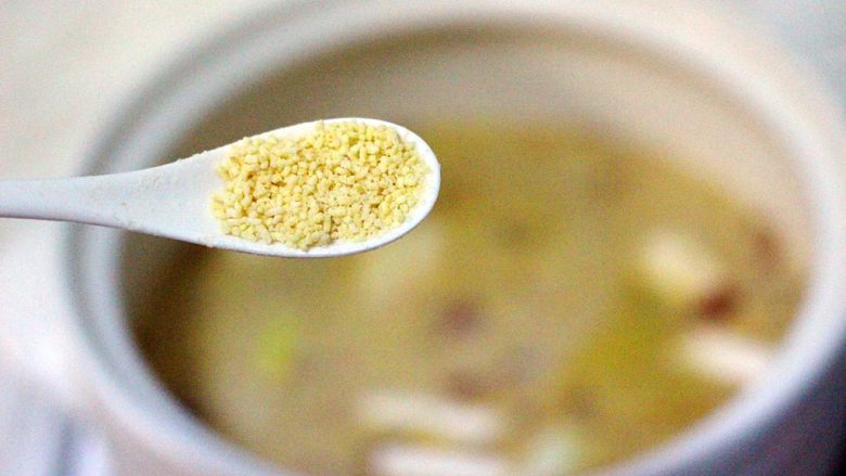 7. 同时倒入盐焗鸡粉、加热过程中、需搅拌均匀、盐焗鸡粉充分溶入汤底