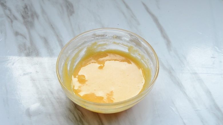 14. 冷藏的卡仕达酱取出,挖三分之一到奶锅里,吉利丁片泡水软化后放入奶锅