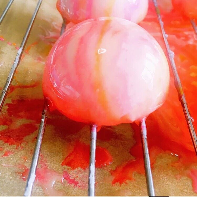 27. 将桃红色,白色,米黄色的镜面依次倒入粉色镜面中,轻轻搅拌几下,不要过度,否则就不会有梦幻的效果啦。镜面温度在32度时效果最佳。