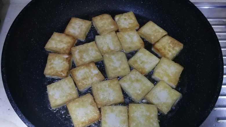 4. 油温八成热时,放入切好的豆腐块,大火煎2分钟左右至底部金黄