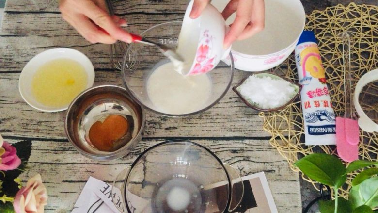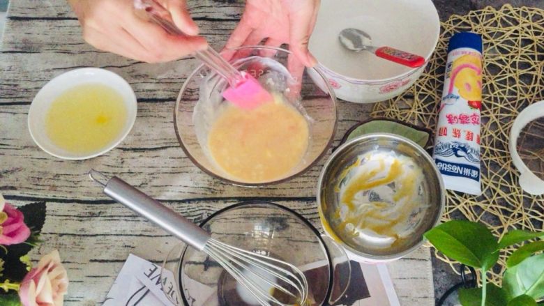 8. 将打散的蛋液倒入牛奶液中,(如果隔水加热融化糖的话,一定要等液体放凉再放入蛋液)。否则蛋液就变蛋花了😂