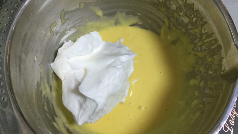 13. 取一小半的蛋白和蛋黄糊用刮刀翻拌均匀,这里的翻拌手法有很多,可以是炒菜的手法,也可以是上下的手法,也可以是从2点位置到8点方向这样切拌手法都可以,唯一不可以的是画圈圈的方式,以免消泡