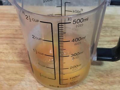 3. 将蛋打入量杯中,三颗蛋约150ML.