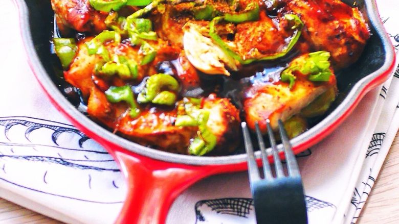 3. 铺好后就是这样。 喜欢的可以把青椒上刷点橄榄油撒点黑胡椒, 不用再给盐,因为我腌制鸡胸的时候已经给了足量的盐;