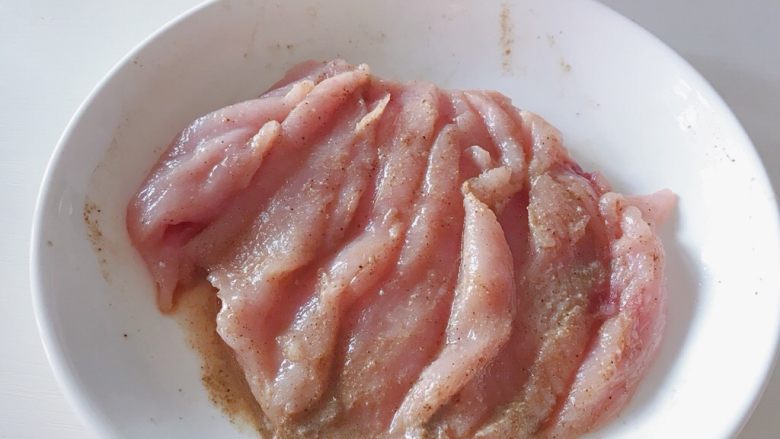 7. 将腌好的鸡胸肉两面均匀裹住面粉
