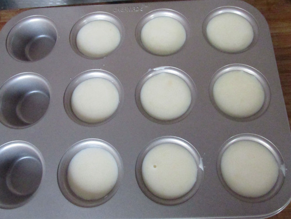 10. 把做好的液体倒入迷你玛芬模具中,我用的量勺舀进去的,这样不会洒出来