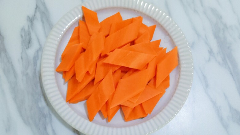 7. 锅中加适量水烧开,放入胡萝卜焯水1分钟,捞出沥干水份备用