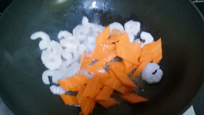 9. 锅中倒油烧热,放入虾仁翻炒片刻