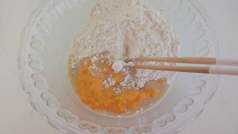 7. 南瓜泥倒入玻璃碗中,加入100克面粉,加入酵母水。