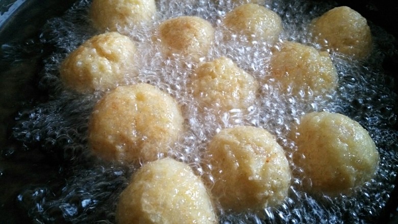 - ps:米饭如果用剩米饭,有点偏硬,可加热至软;饭团一定要炸出脆皮后再小火慢炸2-3分钟