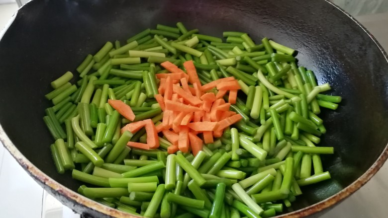 - 平常的日子里要会巧用家里剩下的食材,昨天剩的腊肠,家里有的蒜苔,土豆,还有家里要常备胡萝卜,胡萝卜是百搭菜,有营养又有品相,好看有好吃。这道菜不用葱姜蒜,因为蒜苔已经够味,加上腊肠的风味,就刚刚好,只简单的加点盐和海鲜酱油即可。简单好做又色香味俱全。