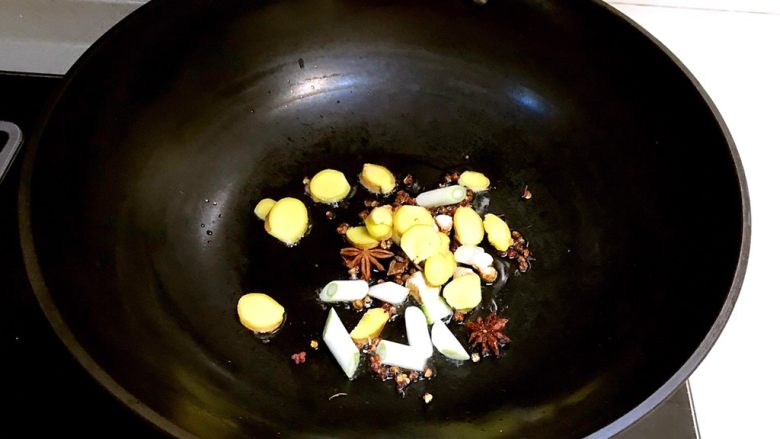 6. 锅内加入大豆色拉油烧热后加入花椒粒,山奈和大料,煸炒出香味