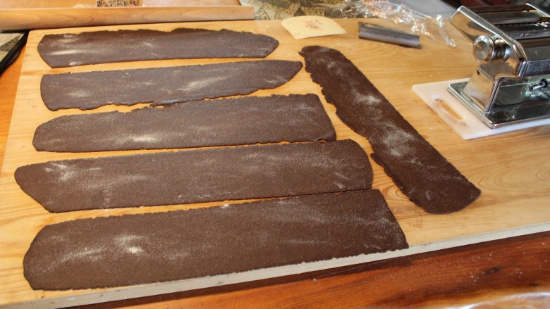 8. 若有制面机就开始用制面机逐渐做出薄面皮。若没有制面机就用手工杆薄。