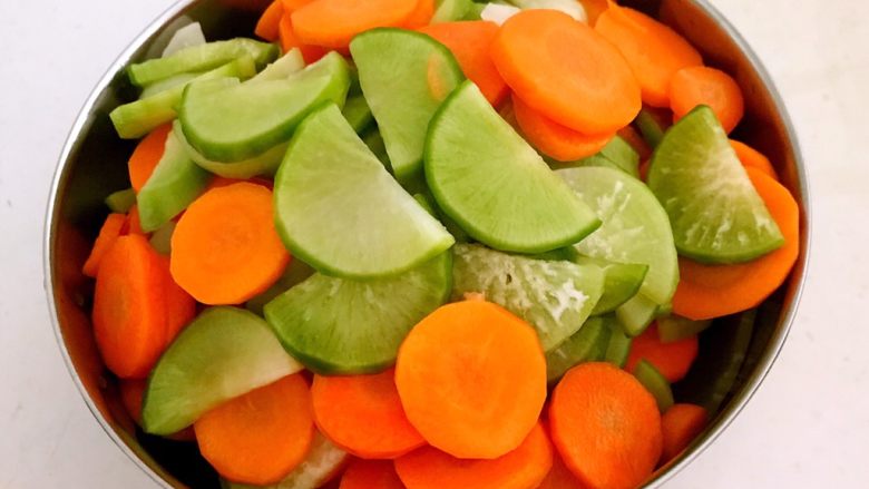 4. 把绿萝卜片和胡萝卜片放入盆中,加入精盐