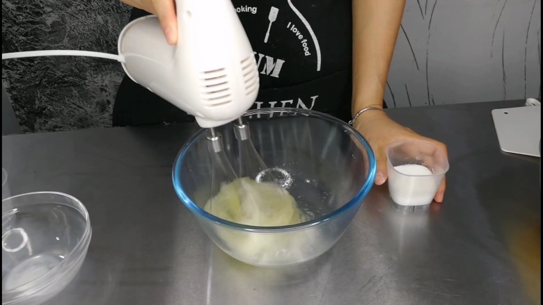 1. 糖加入蛋黄,用手动打蛋器搅拌,需要打发,糖拌匀就可以