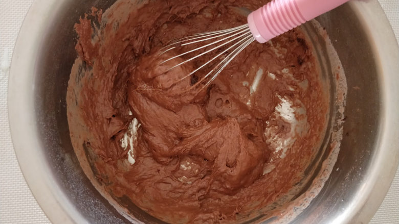 14. 搅拌均匀的可可面糊倒入蛋白霜内。
