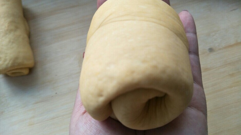 11. 松弛好后,接着同上再擀成长舌状,卷起。