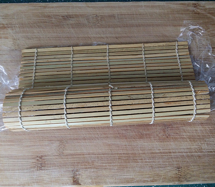 7. 在寿司帘上铺张保鲜膜、放上适量黑糯米饭