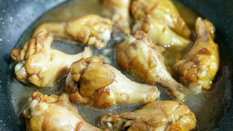 10. 加入腌制好的鸡翅根,翻炒使糖色均匀挂满每个鸡翅根。