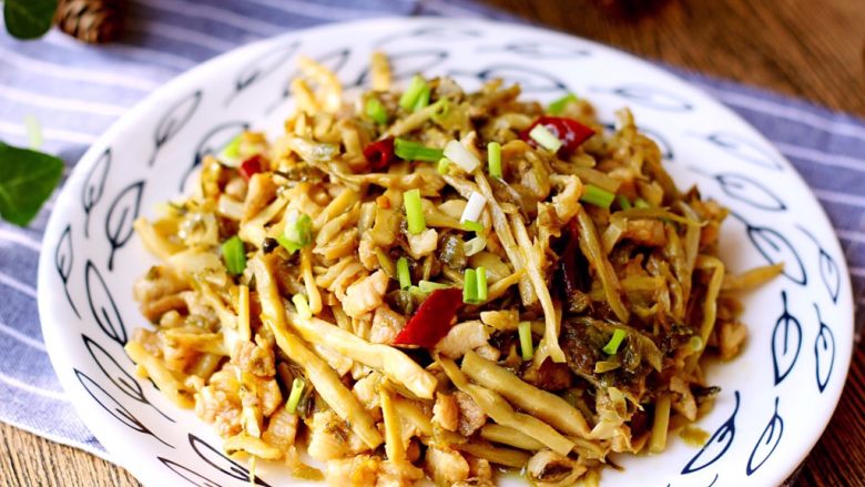7. 放入雪菜嫩笋小菜,再倒入小半碗水大火炒。