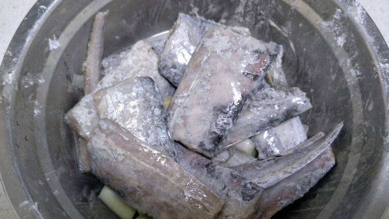 5. 把葱段和姜片放在装有带鱼的盆中。