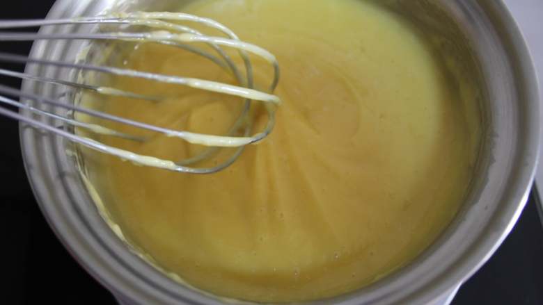 7. 换一个平底锅,把所有溶液倒入,小火不停搅拌至粘稠,如图