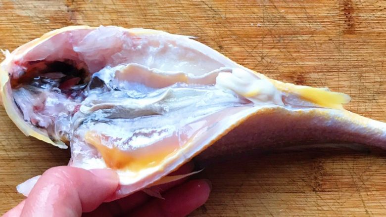 3. 剖开肚子,把腮和肠都去掉,并把黑色的膜也一并取干净