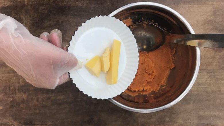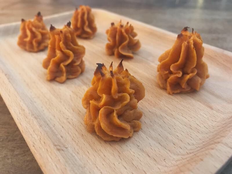 10. 将捣好的地瓜泥装入裱花袋,挤成塔状