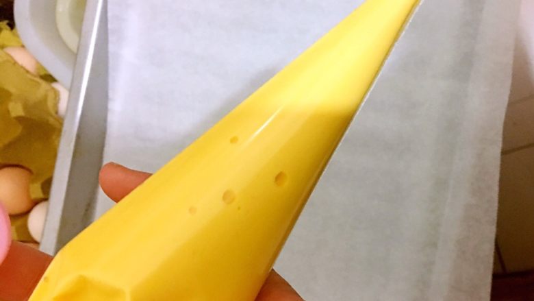 5. 装入裱花袋、排出空气。剪一小口。开始挤成小豆豆,烤箱预热110度。最后放入烤箱中烤,25分钟90度。