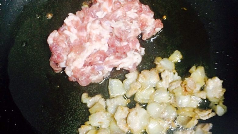 9. 在锅中加入一勺油,油热以后倒入肥肉
