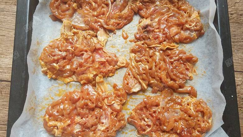 8. 腌好的鸡腿肉放入铺了油纸的烤盘