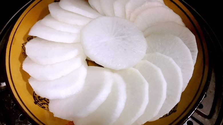 5. 码盘好的白萝卜放入蒸锅