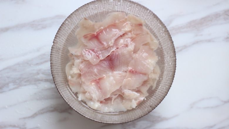 2. 片好的鱼片清水冲洗几遍,泡在水中,让鱼片吸饱水,这样才能保证鱼片的嫩滑口感。