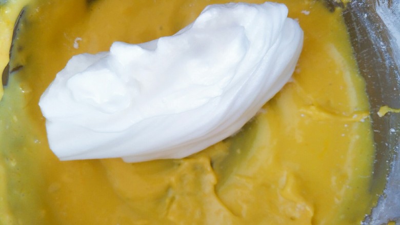 9. 重复上面动作直到把蛋白全部搅拌均匀。 手法要快,不能画圈圈,用翻拌手法就可以,就像炒菜那个从底下往上翻,翻拌的时候手要转动盆子。