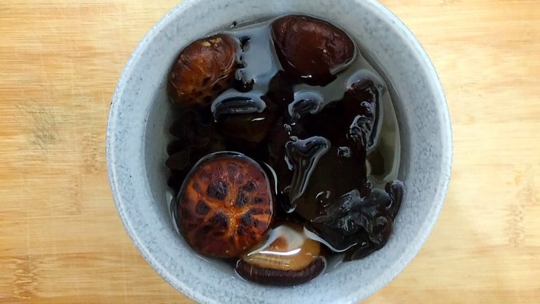 4. 泡发好的香菇去蒂,洗净,切丝,备用
