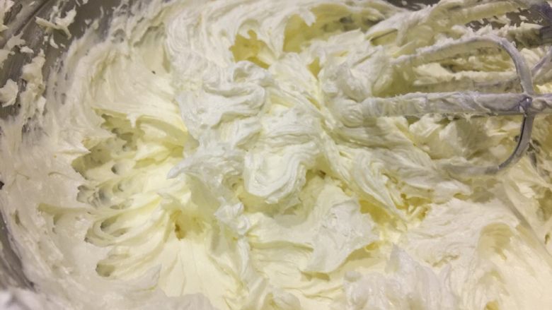 5. 加入盐牛奶,搅打均匀搅打均匀。最后状态如图的羽毛状。