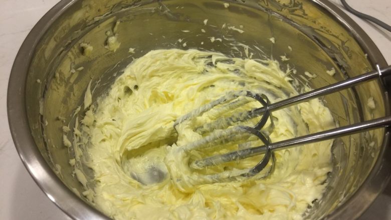 4. 把黄油打发至膨胀发白,加入奶粉,搅打到无颗粒后,再倒入玉米淀粉搅打至羽毛状。