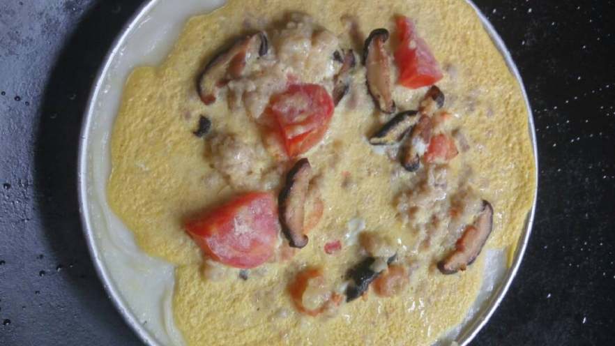 7. 加入一勺米浆抹匀和搅拌好鸡蛋肉,水烧开后放上盘子,上锅蒸