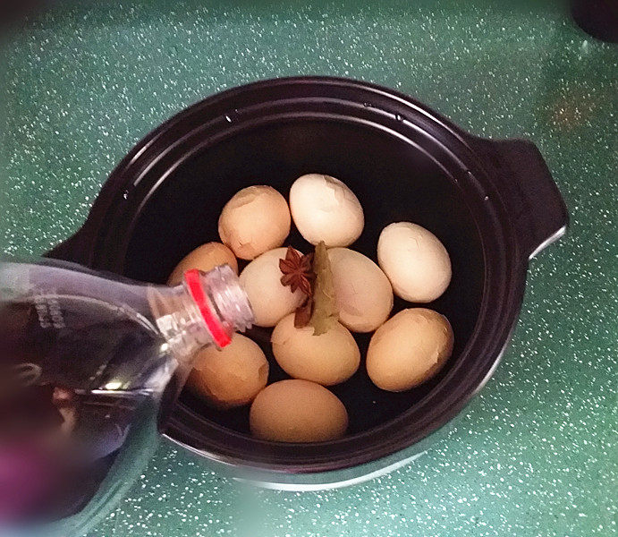 4. 将调料与鸡蛋重新放入砂锅后倒入可乐,可乐量盖过鸡蛋即可