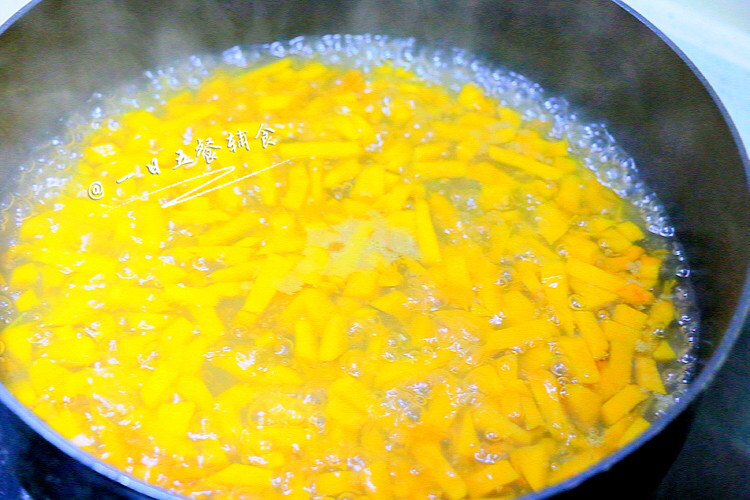 2. 锅中水开后,再煮3分钟南瓜块就已经很软。(喜欢吃糊状的这里用料理机打成糊,想要多锻炼宝宝的咀嚼能力就这样小小块煮熟就蛮好)