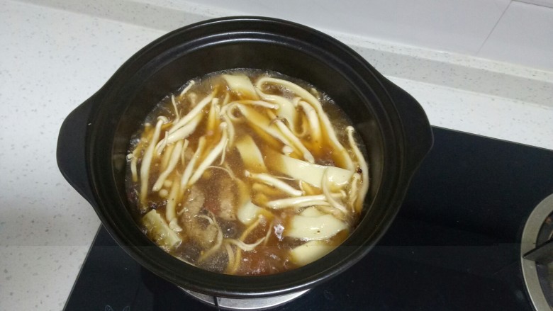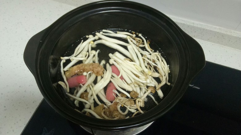 8. 锅中放入适量水,放入白玉菇、小酥肉、脆皮肠。