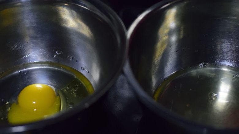 1. 冰箱里取出鸡蛋,分别将蛋清与蛋黄放在两个盆里。其中放蛋清的盆要无油无水。