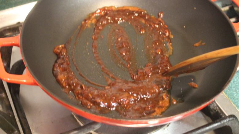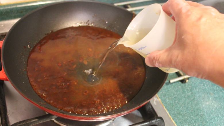 11. 酱汁煮滚后,将剩下一半的板豆腐切块后放入豆瓣酱汁中,煮1-2分钟,让豆腐入味。