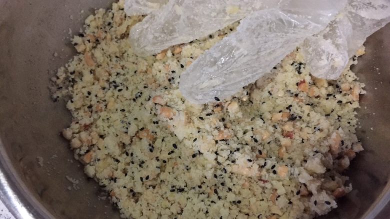8. 放黑芝麻(黑芝麻可以炒锅小火慢炒熟,也可以烤箱160度烤8分钟) 这时候可以预热烤箱175度10分钟