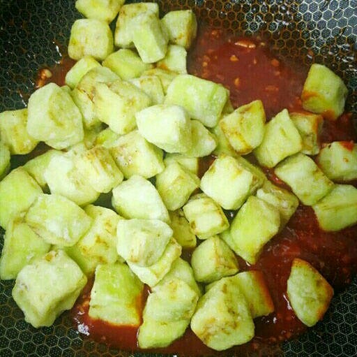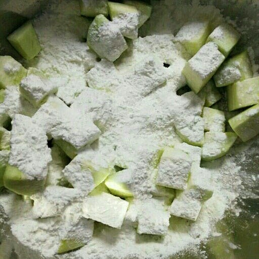 1. 茄子切成小块,加入少许的水再撒上淀粉均裹上淀粉。