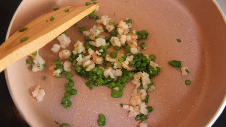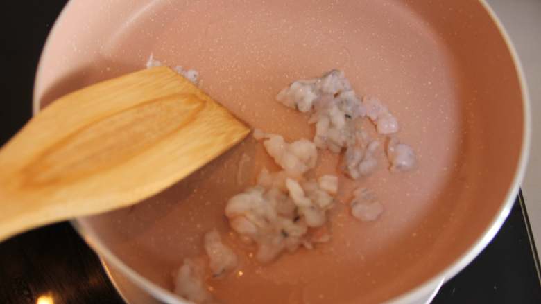 8. 虾仁切碎,加入锅中炒变色