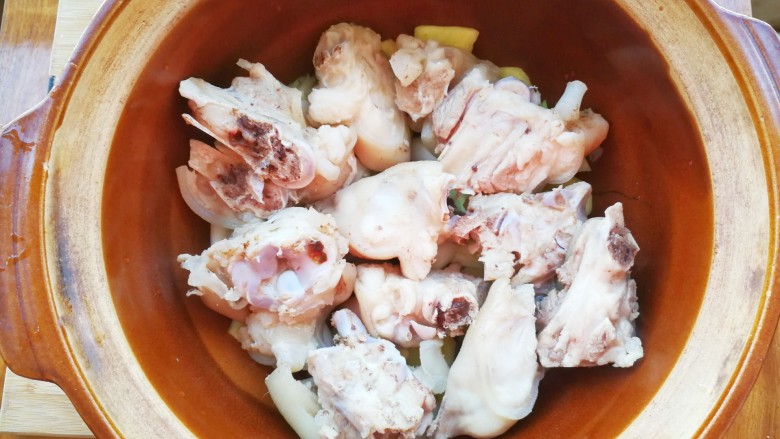 9. 放入焯水过的猪蹄,注意猪蹄皮朝下,